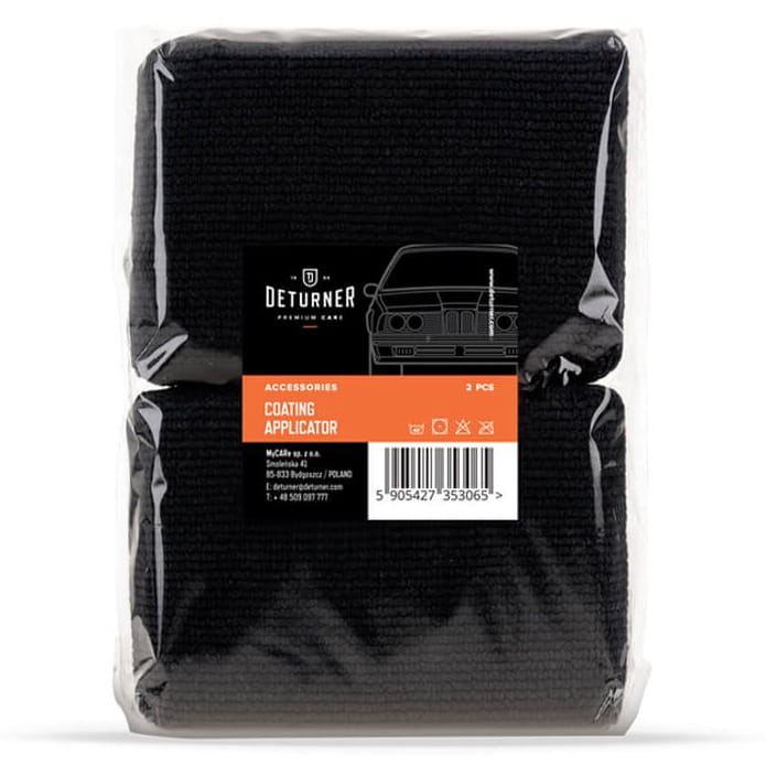 Zestaw dwóch prostokątnych aplikatorów marki Deturner, stworzonych specjalnie do aplikacji powłok ochronnych (np. ceramicznych). Wykonane z dwóch rodzajów materiału i wyposażone w wodoodporną warstwę — nie wchłaniają nadmiaru produktu, co pozwala na szybszą i wydajniejszą pracę.